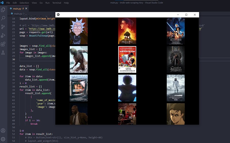 This project is focused on web scraping and utilizes the BeautifulSoup library for this purpose. Additionally, the Kivy framework is employed to develop a Graphical User Interface (GUI) for the project. The purpose of this project is to extract data from IMDB website and visualize them with GUI.